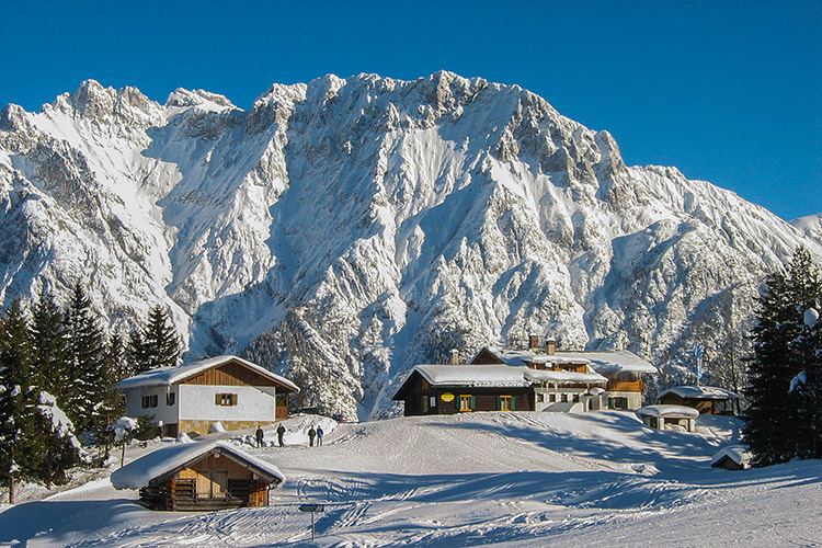 Kranzberggipfelhaus im Winter mit Blick auf Wetterstein